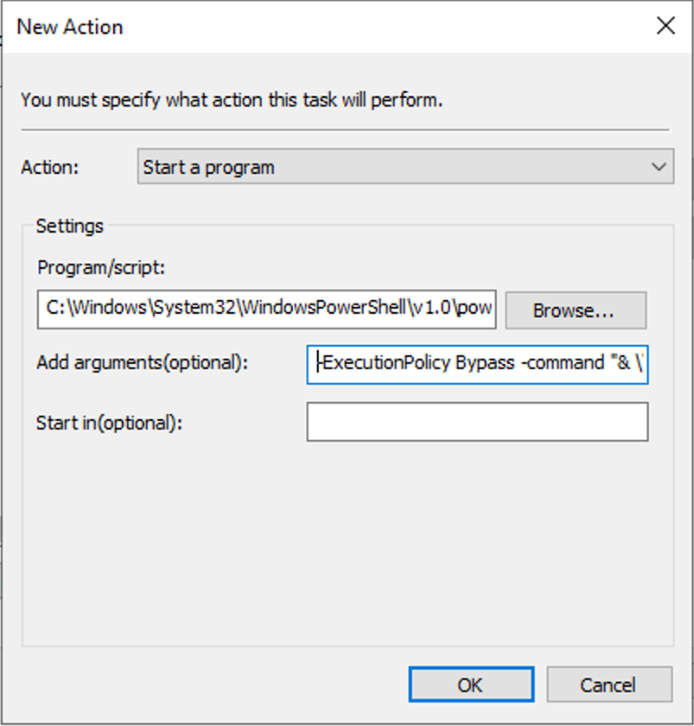Under the Actions tab you’ll want to select “Start a program”. This next bit is important, you need to have it execute PowerShell and put in an argument so it’ll execute your script.