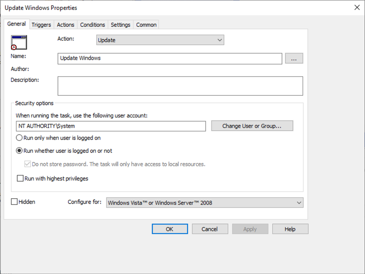 I set this as an Update action and to run using the NT AUTHORITY\System user. Select “Run whether user is logged on or not”.