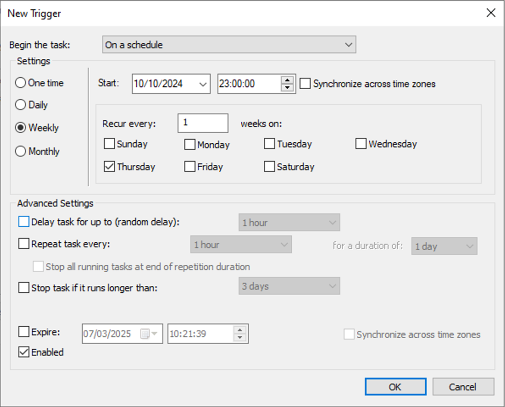 On the Triggers tab you can create the sort of schedule you want this to run. I run ours well after the office has closed as the PCs are usually left on anyway.