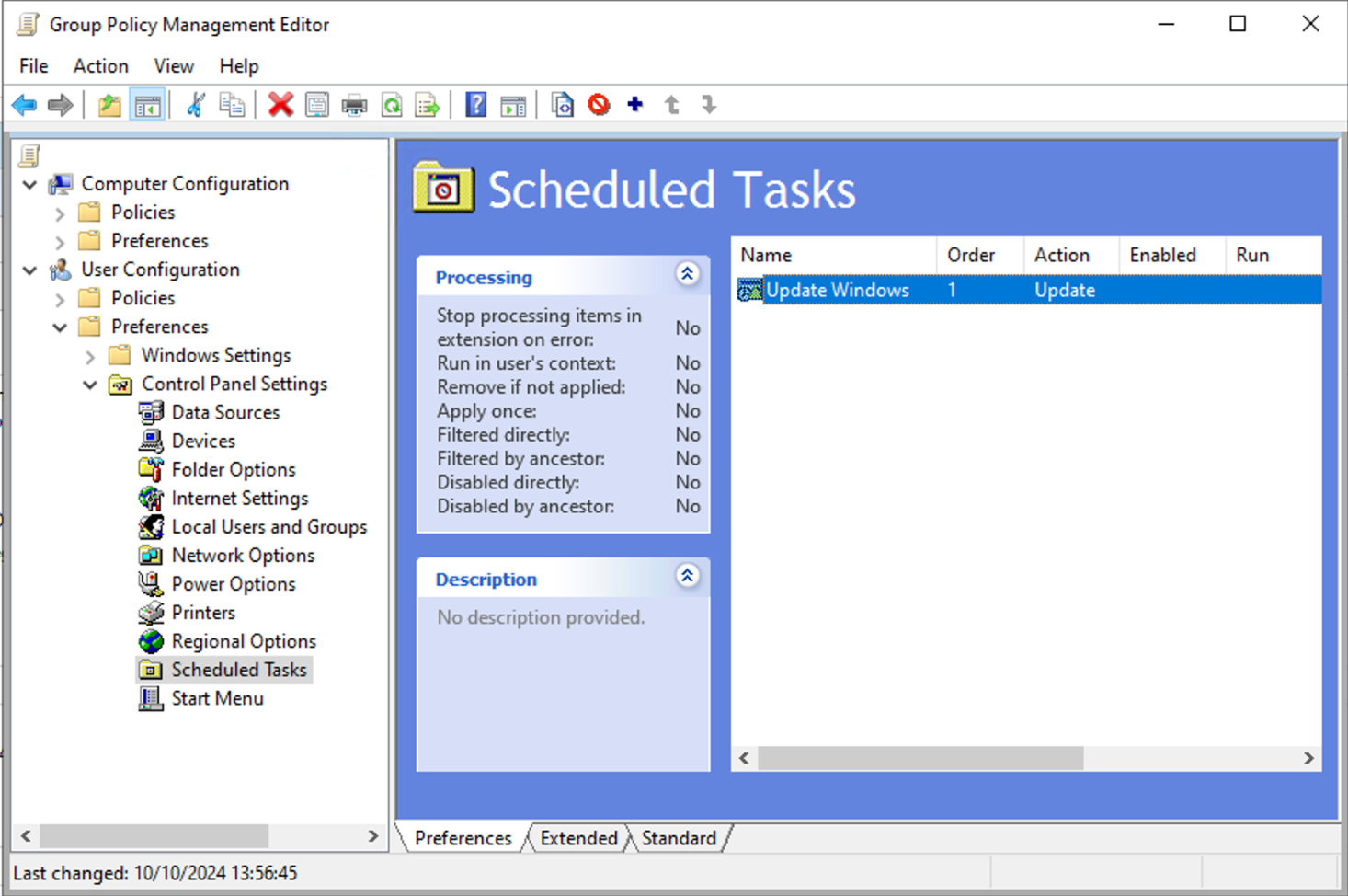 To automate this I wanted to have it run on a scheduled task on a group policy for my team. Head to the Group Policy Management Editor and go to User Configuration > Preferences > Control Panel Settings > Scheduled Tasks. Right-click that and click on New > Scheduled Task.